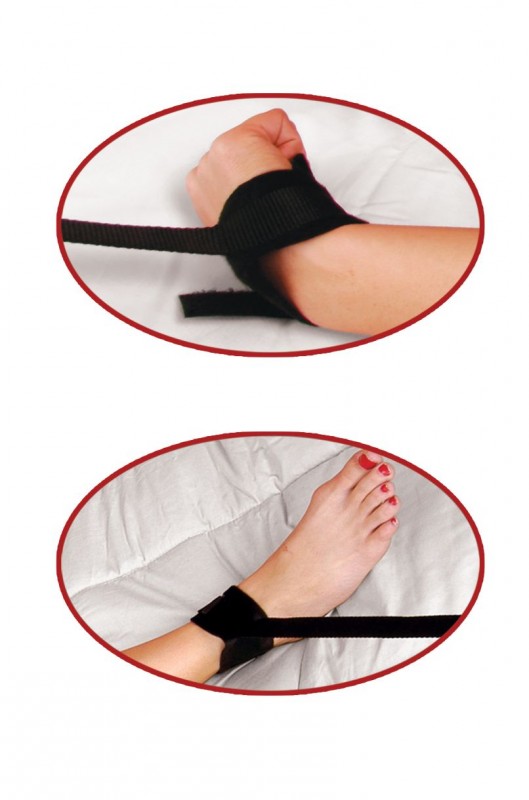 - Наручники и наножники из нейлона на липучках. Каждый манжет имеет нейлоновую ленту, которая крепится к ножкам кровати или стойке, что позволяет зафиксировать партнера в позе "морская звезда"!