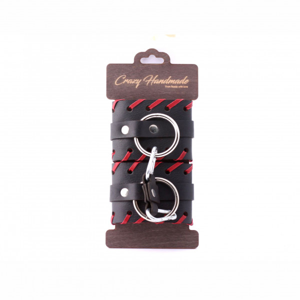 Выполнены оковы из натуральной кожи в черном цвете и декорированы красной плетеной окантовкой и металлическими клепками