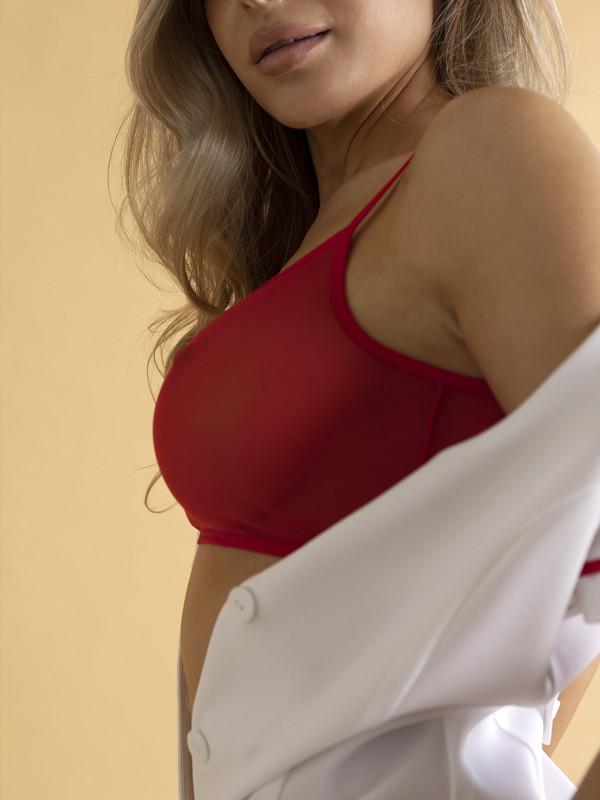 Топ из микросетки в срастном красном цвете отлично гармонирует с халатиком